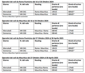 “Siamo lieti di accogliere i nuovi collegamenti di Air Mauritius che, dalla prossima Winter, si aggiungerà al portafoglio di compagnie aeree operative su Roma Fiumicino avviando un volo bisettimanale con la capitale mauriziana Port Louis” commenta Federico Scriboni, Head of Aviation Business Development di Aeroporti di Roma. “Questa novità amplierà ulteriormente la connettività invernale offerta dal nostro aeroporto, contribuendo a sostenere il forte trend di destagionalizzazione dei flussi di traffico al quale stiamo tendendo per massimizzare il potenziale di mercato tutto l’anno”.